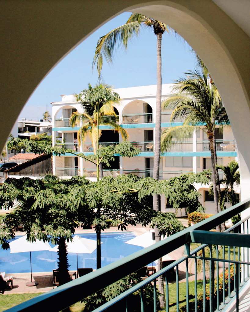 Habitación con vista hacia la piscina del hotel con cálida decoración regional para una estancia agradable y relajante.